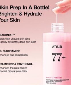 El ANUA Peach 77 Niacin Essence Toner es más que un simple tónico; es un paso esencial para lograr una piel perfecta. Su fórmula rica en antioxidantes combate los radicales libres, mientras que la niacinamida ayuda a reducir las manchas y mejorar la elasticidad de la piel. Úsalo diariamente después de la limpieza para preparar tu piel para los tratamientos posteriores, asegurando una mejor absorción de los productos y maximizando su efectividad.