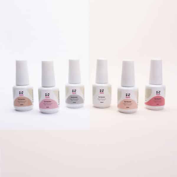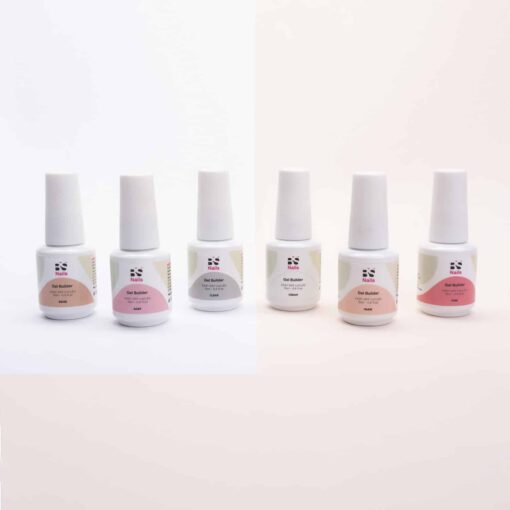 Pack 6 Gel Builder en botella, geles de construcción con viscosidad media (líquido y autonivelante), ideales para crear kapping sobre uñas debilitadas o finas, brindando grosor y nivelación a la uña para un mejor esmaltado.