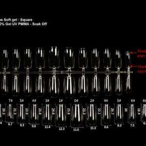 • Tips Soft Gel Square ( punta cuadrada)  ultradelgados y flexibles .Fabricados 100% PMMA  Resina Gel UV – Soak off – ultra transparente y flexible, que traspasa el 95% de la Luz UV para un polimerizado completo.