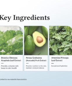 La crema también incluye concentraciones significativas (10.000ppm cada una) de Extracto de Hoja de Artemisia Princeps, Extracto de Fruta de Persea Gratissima (aguacate) y Extracto de Hoja de Brassica Oleracea Acephala, lo que ofrece un enfoque integral para el cuidado de distintas necesidades de la piel.