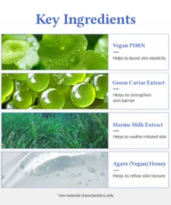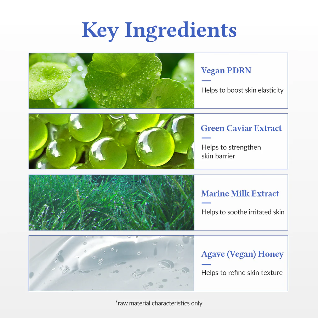 Ingredientes: Bambusa Vulgaris Water, 1,2-Hexanediol, Water, Glycerin, Ethylhexylglycerin, Niacinamide, Raffinose, Panthenol, Propanediol, Xanthan Gum, Lactococcus Ferment Lysate, Fructooligosaccharides, Centella Asiatica Extract, Cyperus Rotundus Root Extract, Sodium Chloride, Sodium Hyaluronate, Adenosine, Tromethamine, Carbomer, Disodium Edta, Sodium Dna, Agave Tequilana Leaf Extract, Maltodextrin, Hydrolyzed Gardenia Florida Extract, Hizikia Fusiforme Extract, Sargassum Fulvellum Extract, Laminaria Japonica Extract, Butylene Glycol, Caulerpa Lentillifera Extract, Guaiazulene, Sodium Hyaluronate Crosspolymer, Dimethyl Isosorbide, Oleyl Alcohol, Hydrolyzed Hyaluronic Acid