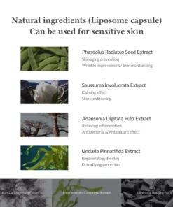 - Enriquecido con extracto de semilla de Phaseolus Radiatus y Undaria Pinnatifida, ingredientes naturales ideales para pieles sensibles.