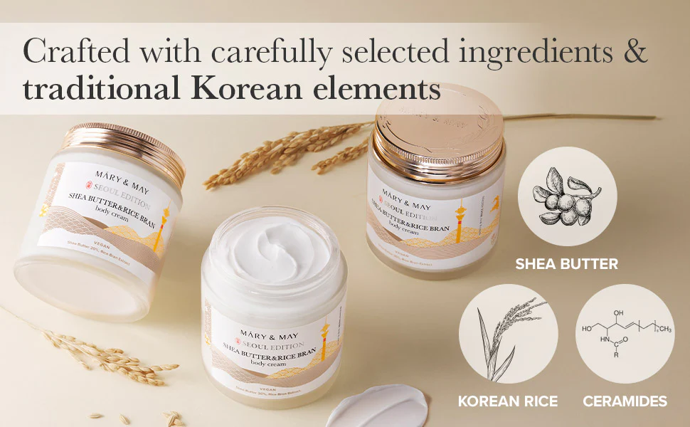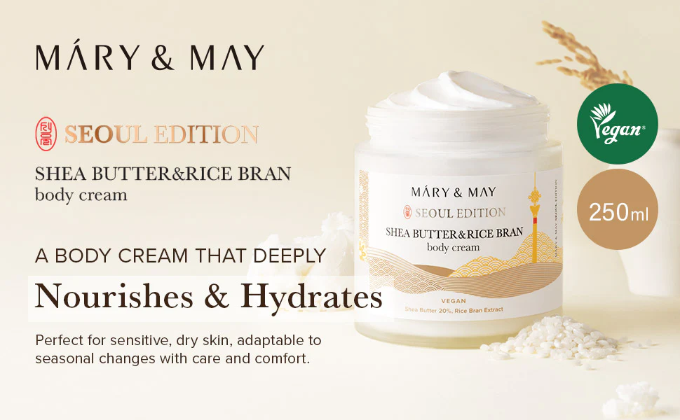 Dale a tu piel el cuidado que merece con la MARY&MAY Shea Butter & Rice Bran Body Cream y disfruta de una piel radiante y perfectamente hidratada todos los días.
