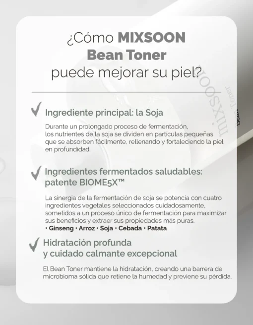 - Hidratación Profunda: El extracto de frijol fermentado hidrata intensamente la piel.