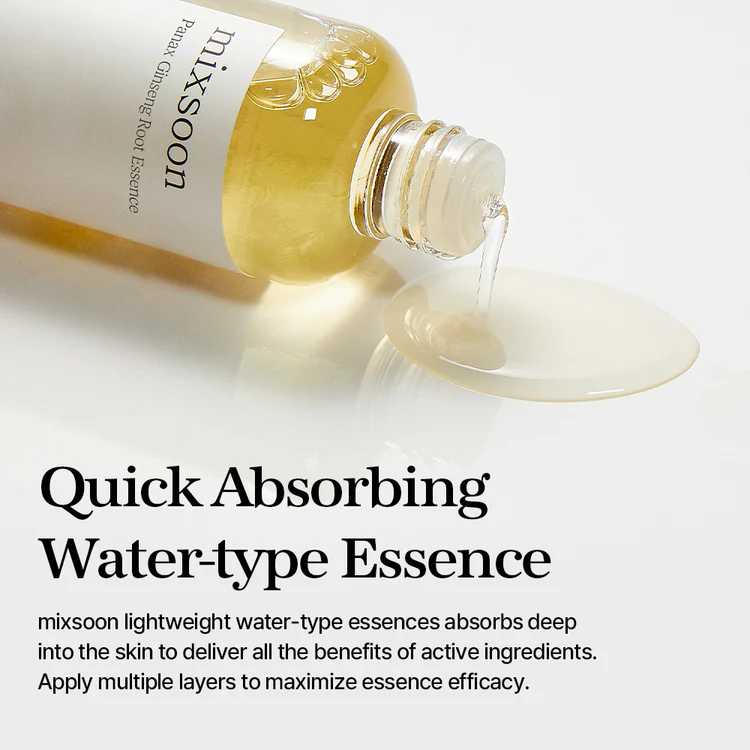Mixsoon Panax Ginseng Root Essence es una esencia facial que destaca por su formulación exclusiva con alto porcentaje de concentración de extracto puro de raíz de Panax Ginseng. Este producto ha sido meticulosamente diseñado para ofrecer una nutrición profunda y efectiva a la piel, aprovechando al máximo las propiedades del ginseng, un ingrediente tradicionalmente venerado en la medicina asiática por sus numerosos beneficios para la piel. La esencia está concebida para revitalizar y transformar la piel, dándole un aspecto más radiante y saludable desde la primera aplicación.