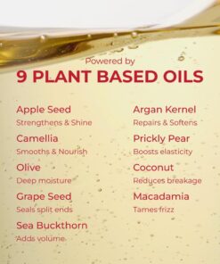 • Nutrición y brillo de lujo: enriquecido con 9 aceites vegetales premium —incluyendo argán, coco, macadamia y oliva— que aportan hidratación profunda, suavidad y un acabado sedoso, restaurando la vitalidad del cabello sin dejar sensación grasa.