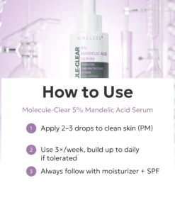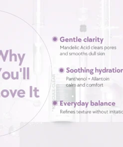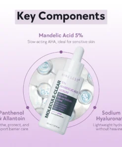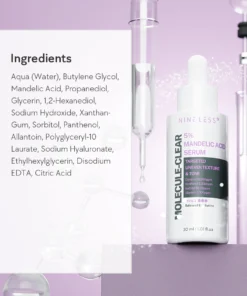 Ingredientes: Aqua (Water), Butylene Glycol, Mandelic Acid, Propanediol, Glycerin, 1,2-Hexanediol, Sodium Hydroxide, Xanthan Gum, Sorbitol, Panthenol, Allantoin, Polyglyceryl-10 Laurate, Sodium Hyaluronate, Ethylhexylglycerin, Disodium EDTA, Citric Acid