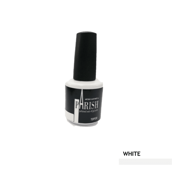 Top Ish soak-off White. El top con aroma de Parish crea una terminación de alto brillo, su presentación de 15 ml es suficiente para 40-50 clientes.