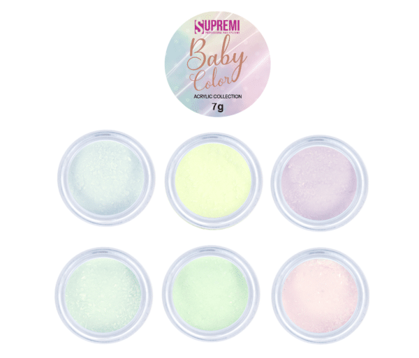 Set de Polvos acrílicos Baby Color de Supremi, es una colección que  contiene 6 frascos de polimero acrílico de alta calidad , con pigmentación homogénea  , que  proporcionan una consistencia ideal para un acabado perfecto, adhesión superior y  es ideal para hacer relieves y diseños 3D.