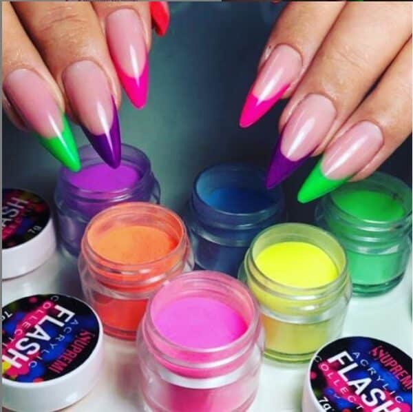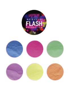 Set de Polvos acrílicos Flash Neon de Supremi, es una colección que  contiene 6 frascos de polimero acrílico de alta calidad , con pigmentación homogénea en tonalidades Neon , que  proporcionan una consistencia ideal para un acabado perfecto, adhesión superior y  es ideal para hacer relieves y diseños 3D.
