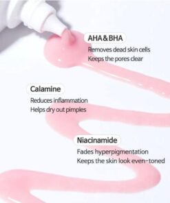 Ingredientes: Purified Water, Niacinamide, Propanediol, Ethanol, Cetylethylhexanoate, Calamine, Dimethicone, Glyceryl Stearate, PEG-100 Stearate, Polysorbate 60, Cetearyl Alcohol, Arachidyl Alcohol, Behenyl Alcohol, Arachidyl Glucoside, Sorbitan Stearate, Allantoin, Salicylic Acid, Lactic Acid, Zinc Pca, Alpha-bisabolol, Tea Tree Leaf Oil, Spearmint Leaf Oil, Methylpropanediol, Laurylpyridinium Chloride, Polyacrylate-13, Polyisobutene, Polysorbate20, Tocopheryl Acetate, PEG-60 Hydrogenated Castor Oil