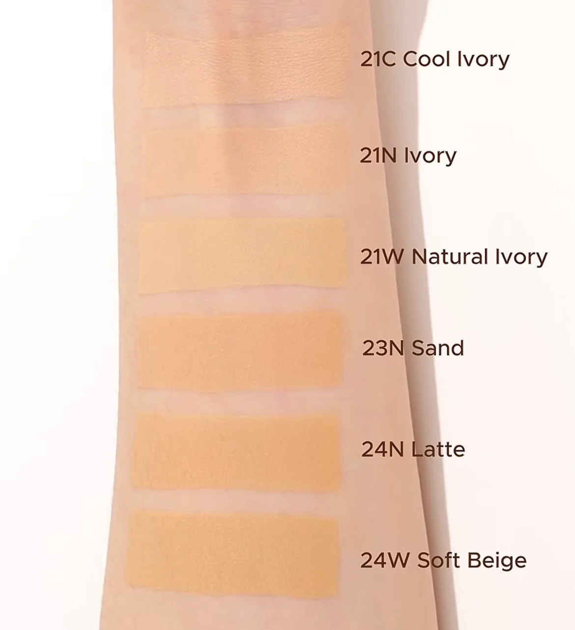 Ingredientes: Water, Cyclopentasiloxane, Iron Oxides (CI 77499), Dimethicone, Synthetic Fluorphlogopite, Trimethylsiloxysilicate, Propanediol, Iron Oxides (CI 77491), Diphenylsiloxy Phenyl Trimethicone, Niacinamide, PEG-10 Dimethicone, Iron Oxides (CI 77492), Isododecane, PEG/PPG-18/18 Dimethicone, 1,2-Hexanediol, Triethoxycaprylylsilane, Magnesium Sulfate, Octyldodecanol, Disteardimonium Hectorite, Potassium Sorbate, Fragrance(Parfum), Polyglyceryl-4 Isostearate, Adenosine, Trisodium Ethylenediamine Disuccinate, Isopropyl Titanium Triisostearate, Polymethyl Methacrylate, Haematococcus Pluvialis Oil, Butylene Glycol, Titanium Dioxide (CI 77891), Glycerin, Dipropylene Glycol, Sodium Palmitoyl Proline, Cetearyl Dimethicone/Vinyl Dimethicone Crosspolymer, Hibiscus Sabdariffa Flower Extract, Astaxanthin, Polyglyceryl-3 Polydimethylsiloxyethyl Dimethicone, Aluminum Hydroxide, Polyhydroxystearic Acid, Rosa Rugosa Flower Extract, Pancratium Maritimum Extract, Neopentyl Glycol Diethylhexanoate, Nymphaea Alba Flower Extract, Propolis Extract.